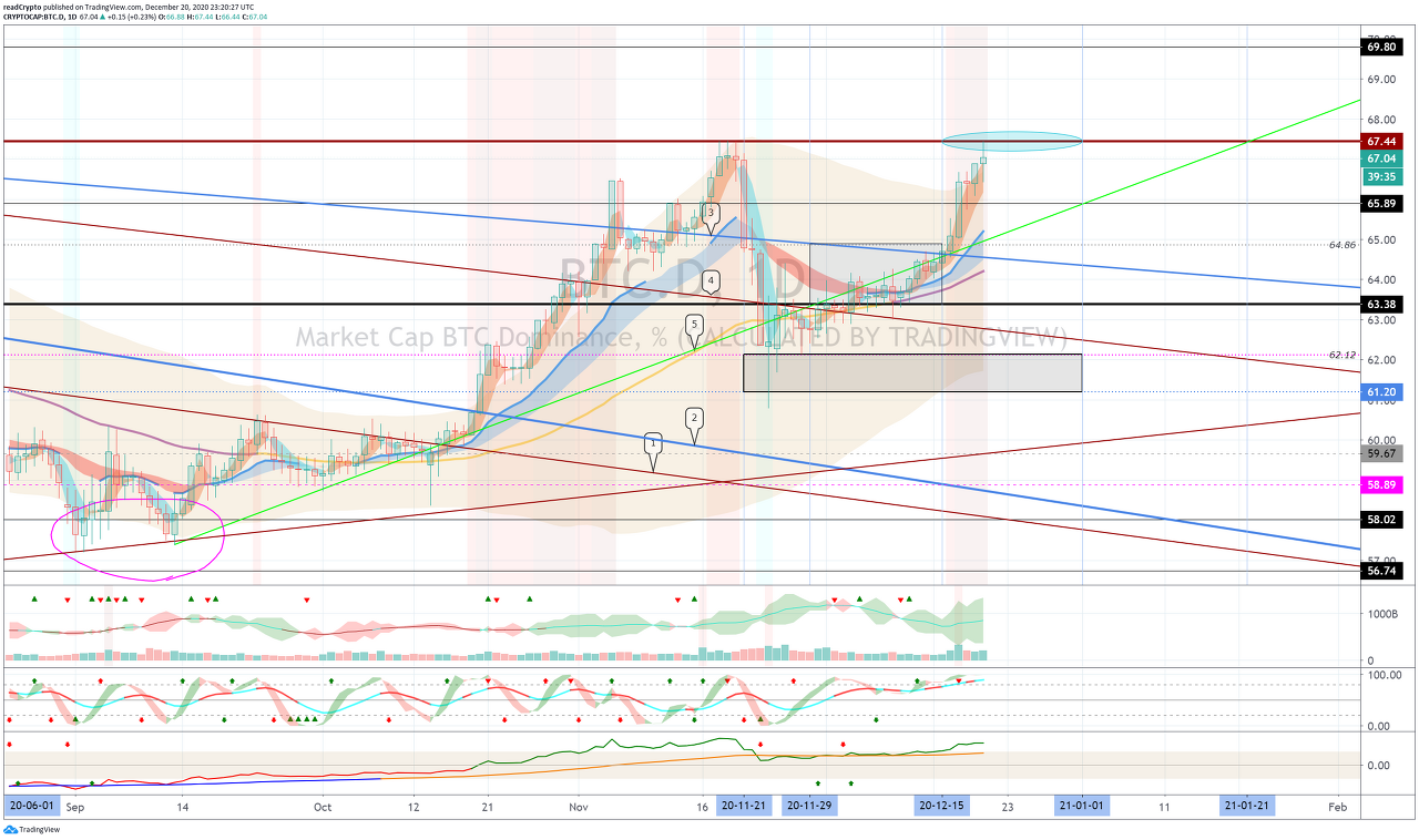 알트 코인의 가격이 상승하기 위해서는 BTC 도미넌스는 하락해야 합니다.