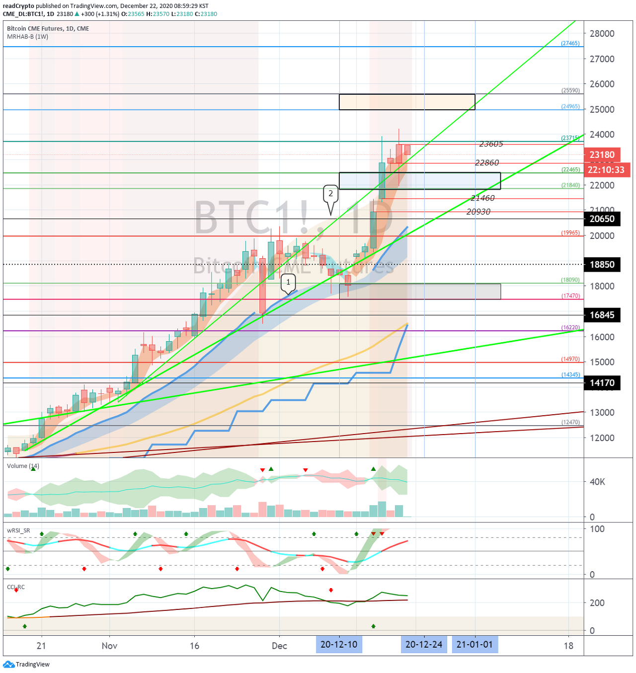 12월 24일경의 변동성으로 22465.0-24965.0 구간에서 벗어나는 움직임이 나오는지 지켜봐야 합니다.