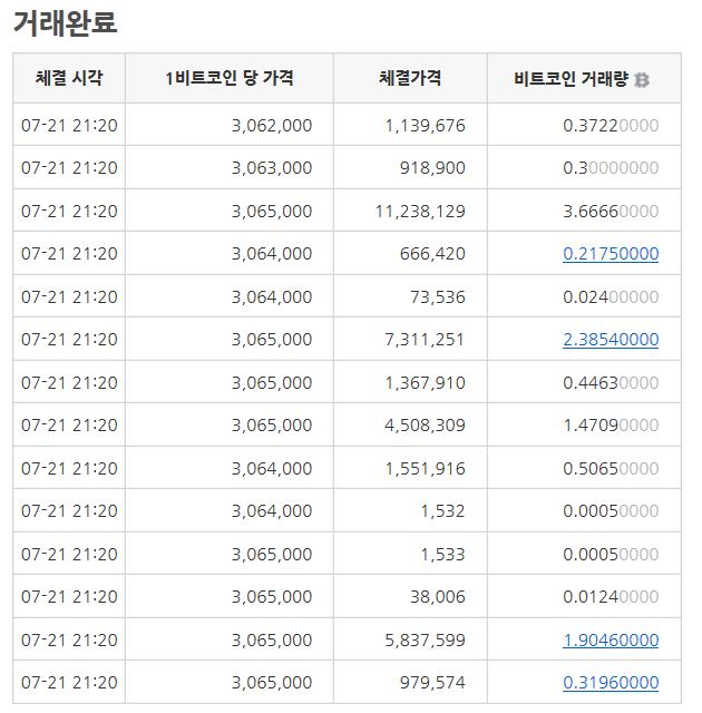 거래완료창은 위와 같습니다.가장 오른쪽은 거래 시간.중간은 거래량.그리고 가장 좌측 초록색,빨간색 숫자가 거래가격입니다.초록색 글짜는 이전 가격보다 높게 거래되었을때 빨간색은 이전 가격보다 낮게 거래되었을때로 예를 들어 계속 초록색 글짜로 거래완료가 뜨면 상승장이라 볼 수 있으며,빨간색으로 나열되면 하락장이라 볼 수 있습니다.