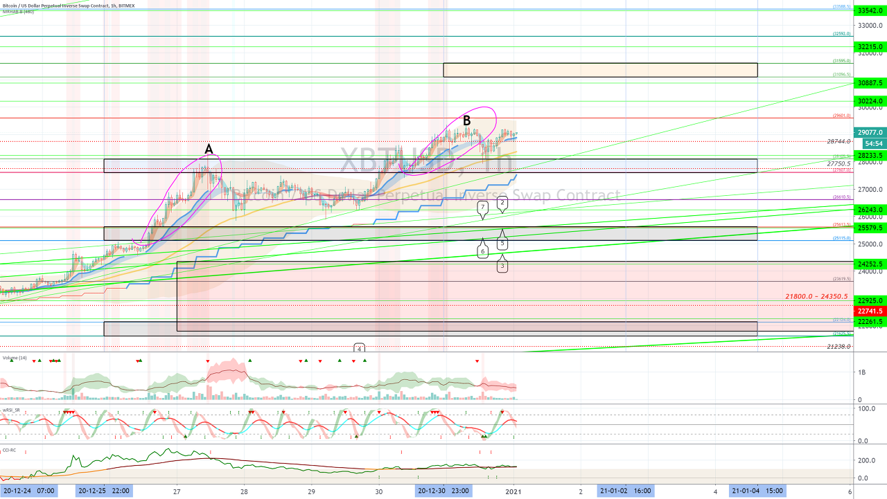 하지만, 1월 2일-8일의 변동성 기간에 27039.5 지점이나 상승 추세선 (6)을 터치하고 상승할 수 있으므로 신중한 트레이딩이 필요합니다.