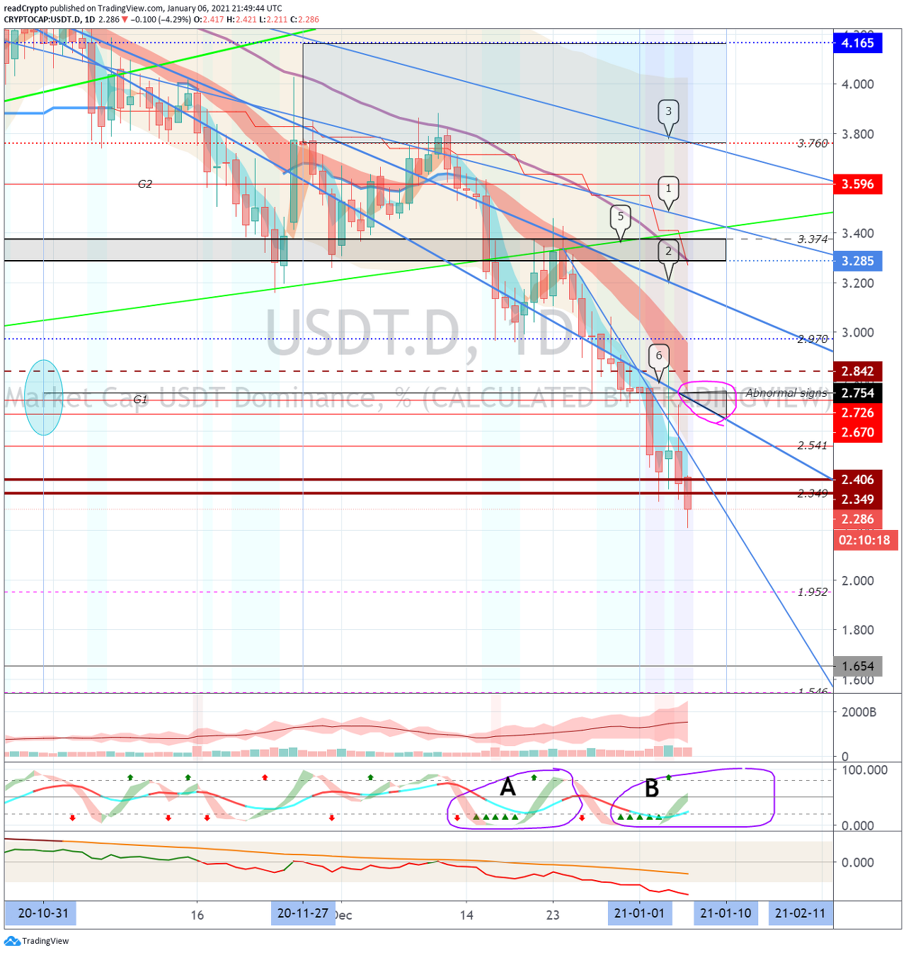 지표의 움직임과 USDT 도미넌스의 움직임이 반대로 움직이고 있습니다.