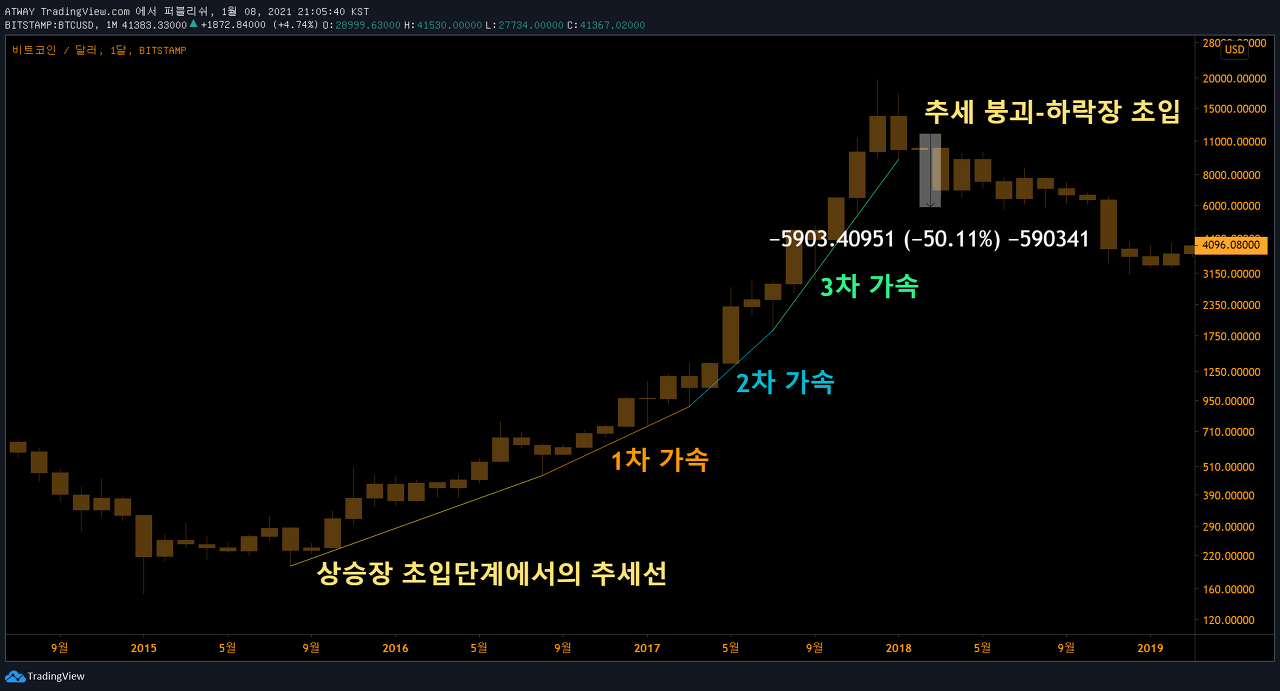 그리고 추세가 가속화되는 지점들이 생기면서 시장이 과열되는 단계에서 일반 대중들이 시장에 진입하게 됩니다.