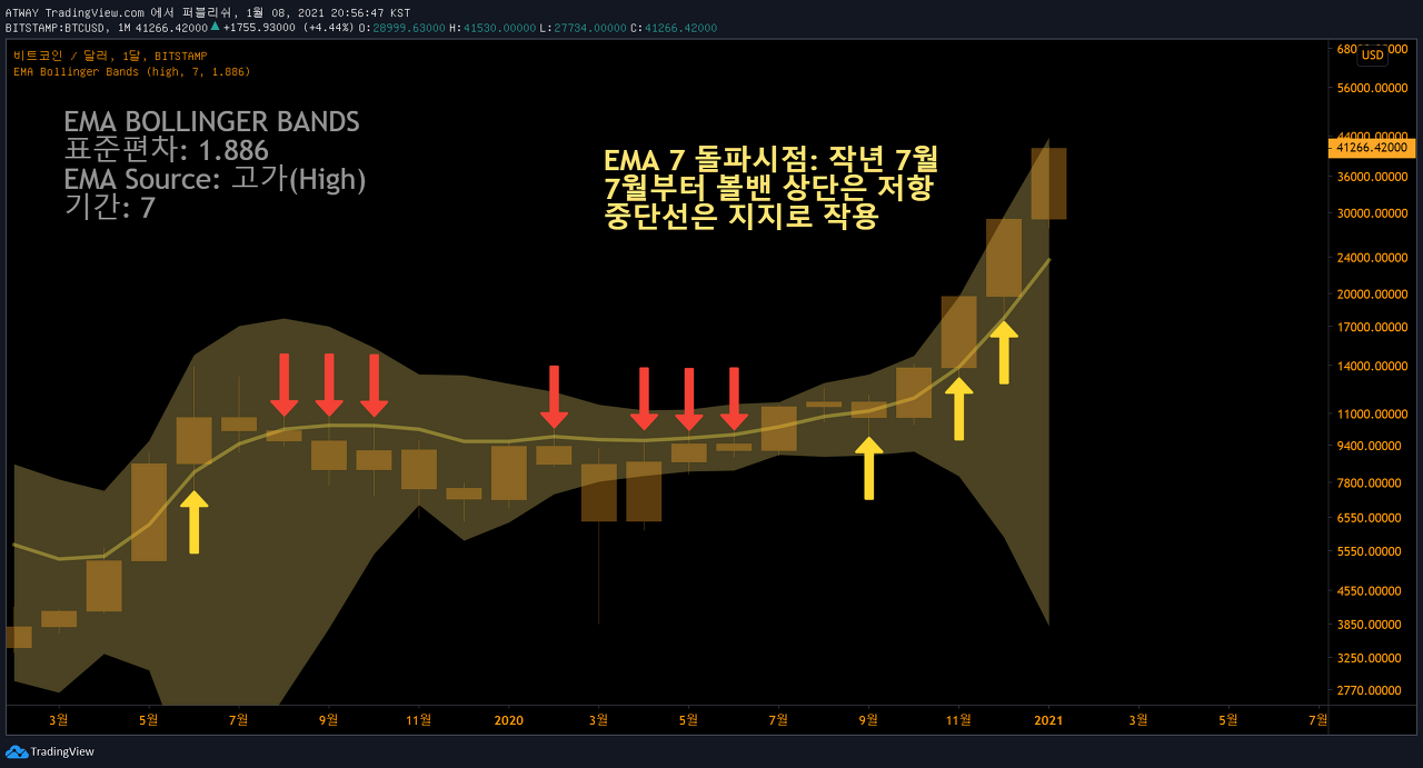 이렇게 세팅을 적용했을 시 비트코인 사이클에서 상승장일때는 볼밴 상단이 저항으로, 중단선이 지지로 작용하였으며 하락장에선 중단선에서 저항받는 경향을 보였습니다.