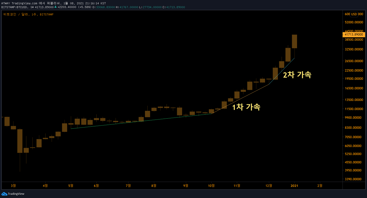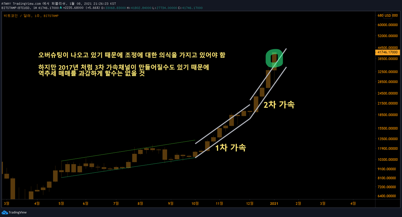 2차 가속채널을 크게 벗어난 상태이기 때문에 내달까지 3만불 이하로 내려가는 큰 조정만 나오지 않는다면 3차 가속채널이 등장할 수 있습니다. 그렇게 된다면 후발주자들도 큰 수익을 거둘 수 있을것입니다.