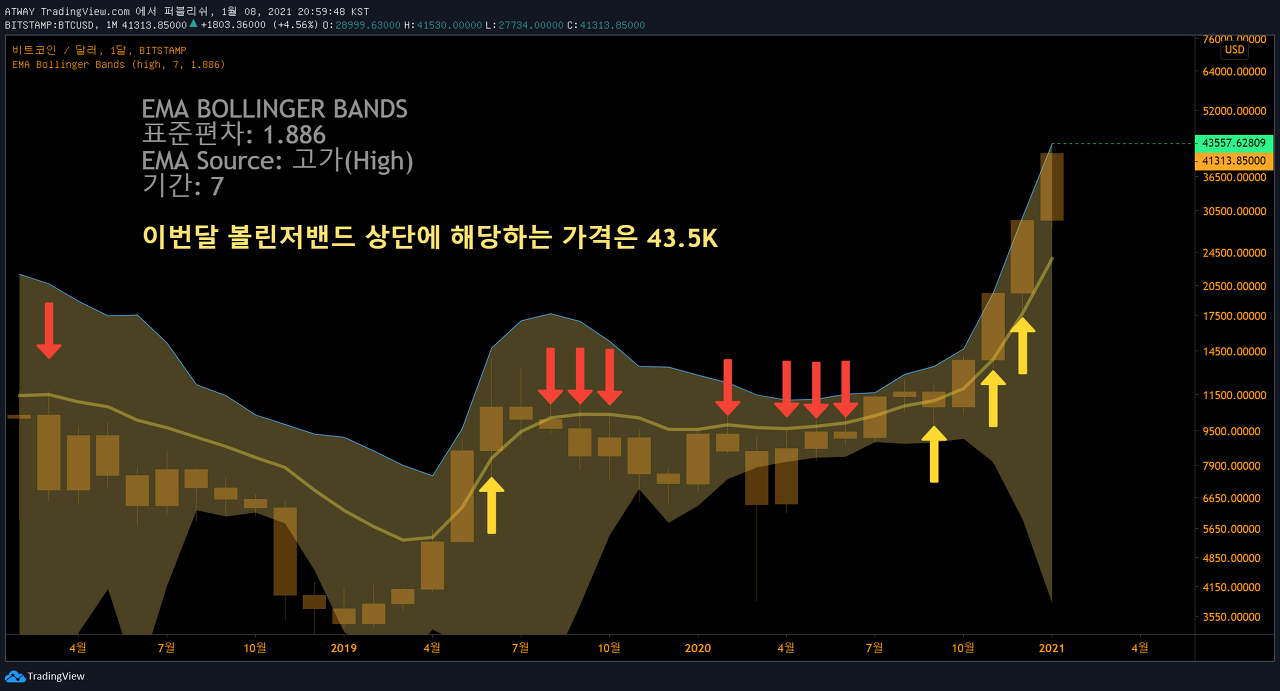 2. 볼린저밴드: 이번달은 4만3천500달러까지?