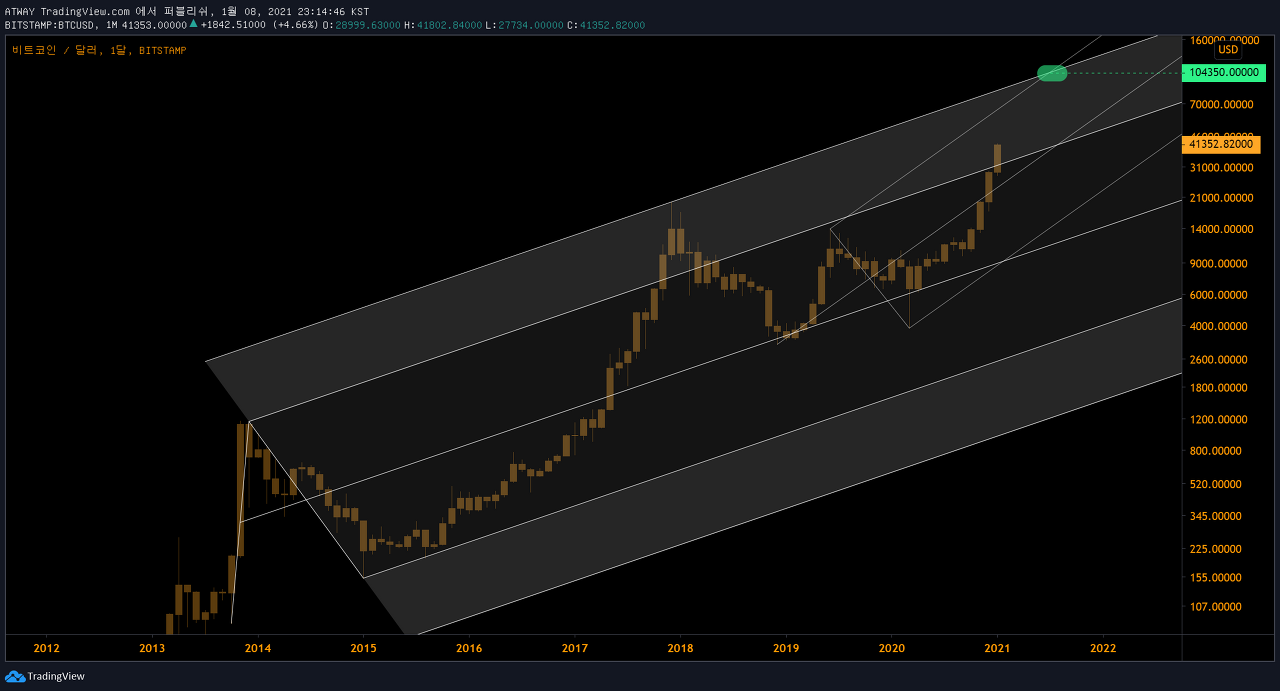 이를 산술적으로 대입해보면 이번상승장의 최종목표가는 약 14만 2천불이 될 수 있다는 결론을 도출할 수 있습니다.