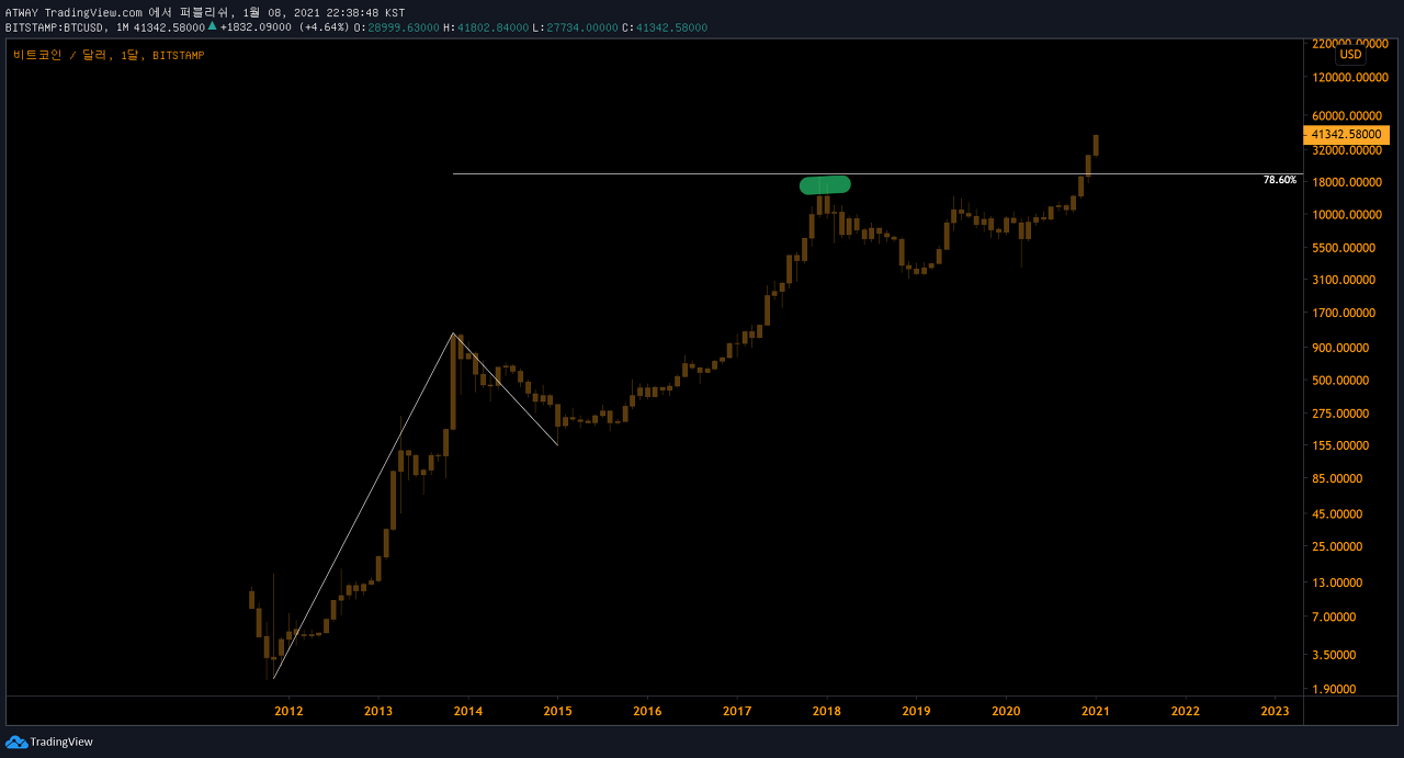 이를 산술적으로 대입해보면 이번상승장의 최종목표가는 약 14만 2천불이 될 수 있다는 결론을 도출할 수 있습니다.