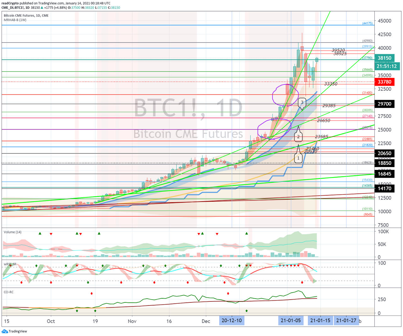 1월 15일경 (1월 14일-16일)의 변동성으로 35964.5-40340.0 구간에서 벗어나는 움직임이 나오는지 지켜봐야 합니다.