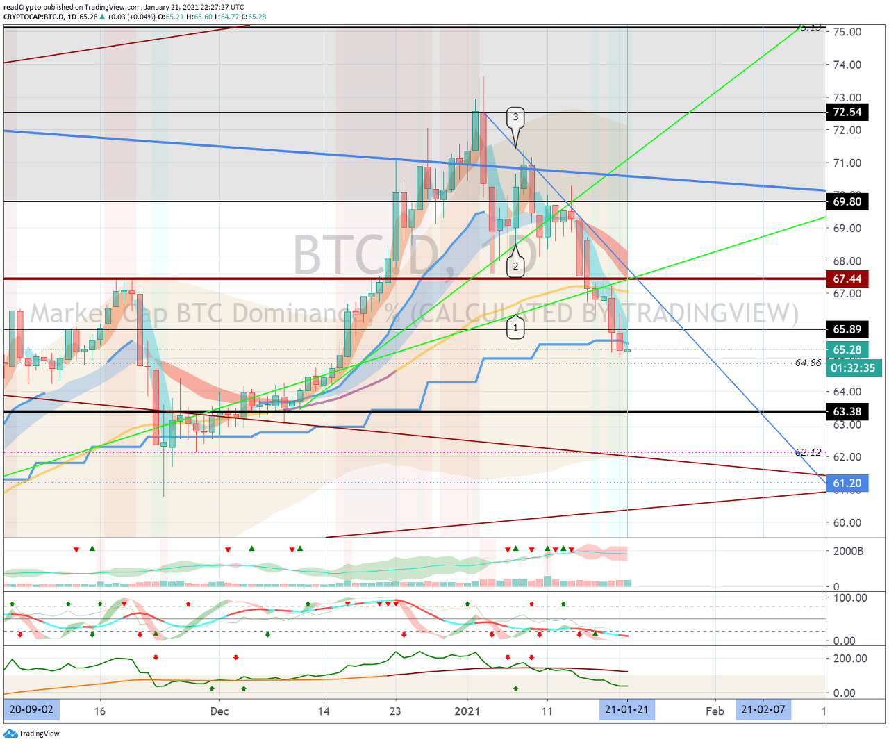 현재 상황에서 BTC 도미넌스가 상승 전환하게 된다면, 코인 시장은 급락이 나올 가능성이 있습니다.