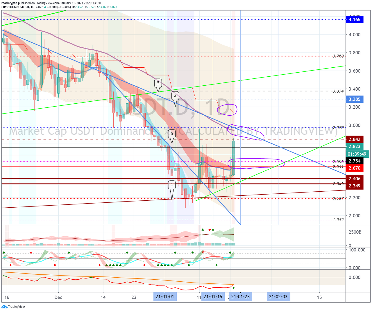 1월 23일경 (1월 22일-24일)의 변동성으로 2.842 지점이나 하락 추세선 (2)을 터치하고 하락할 수 있는지 지켜봐야 합니다.