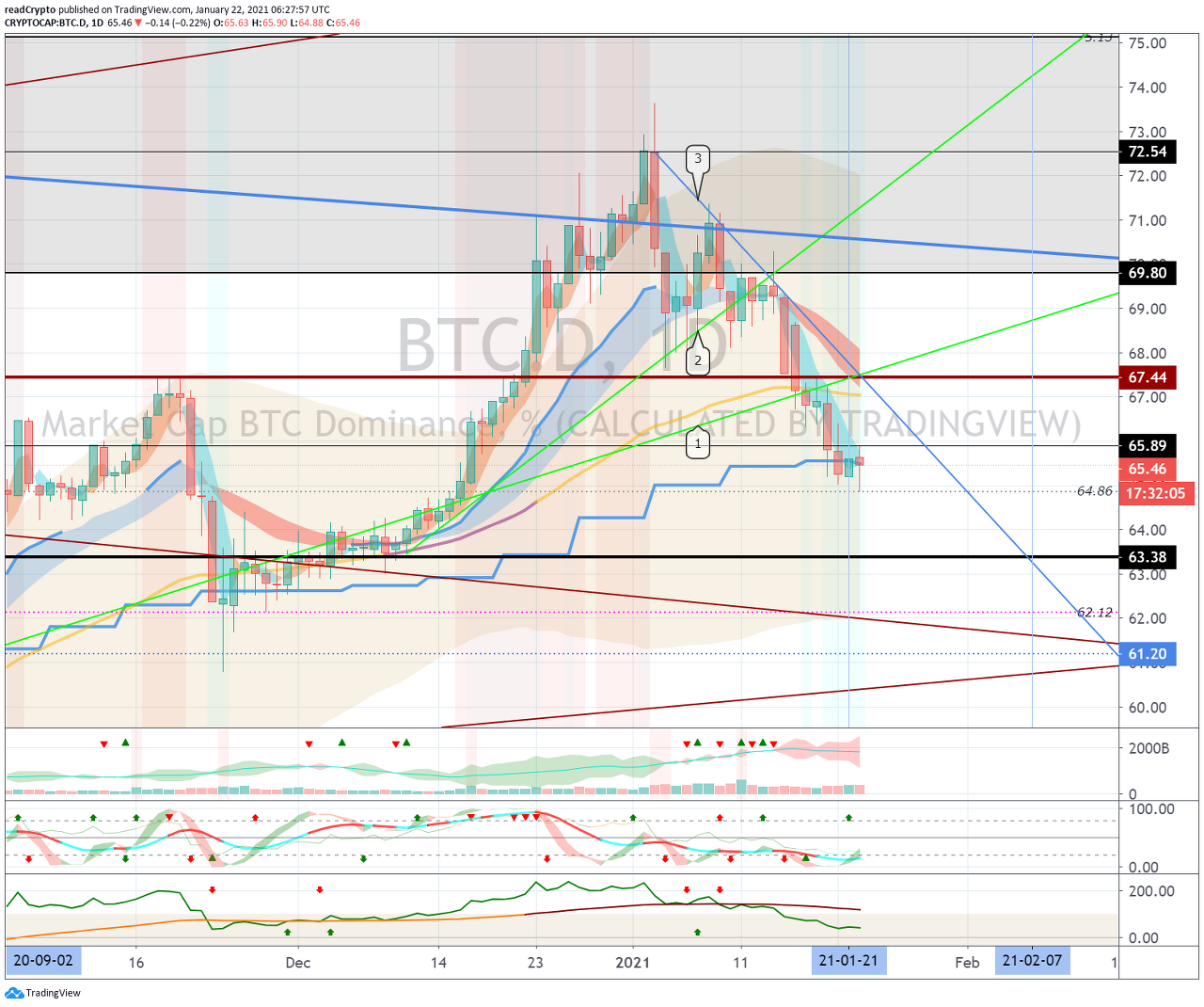 1월 21일경의 변동성으로 64.86-65.89 구간에서 벗어나는 움직임이 나오는지 지켜봐야 합니다.