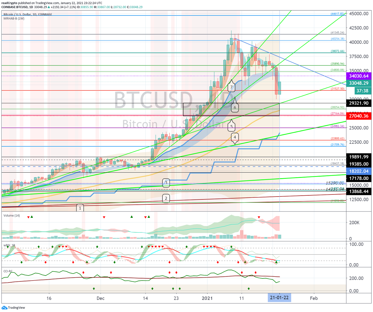 1월 23일경의 변동성으로 31181.4-34413.4 구간에서 벗어나는 움직임이 나오는지 지켜봐야 합니다.