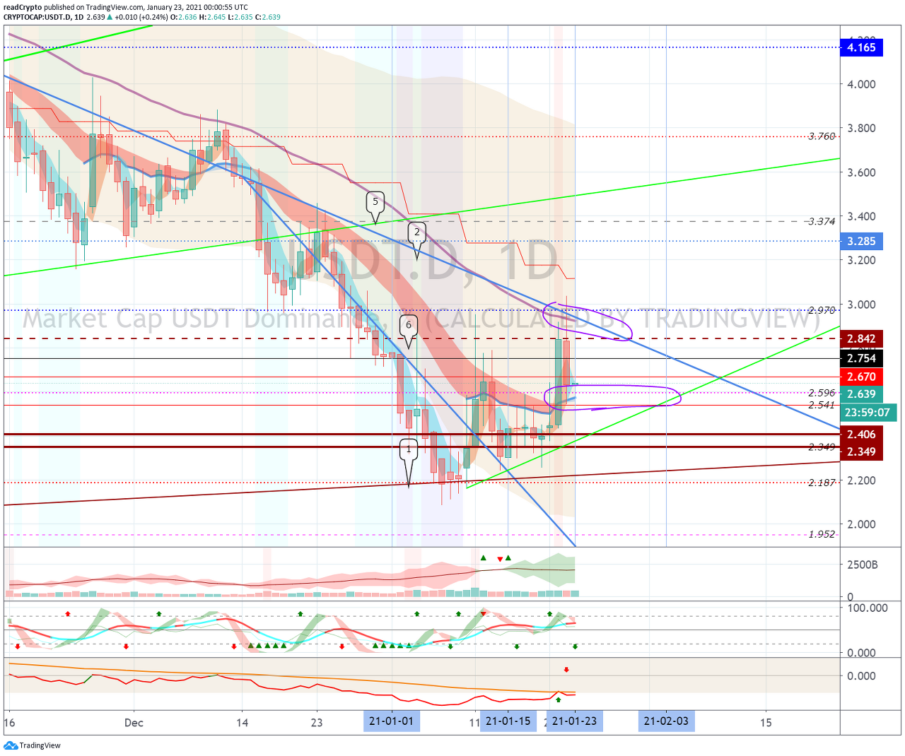 1월 23일경 (1월 22일-24일)의 변동성으로 2.349-2.842 구간에서 벗어나는 움직임이 나오는지 지켜봐야 합니다.