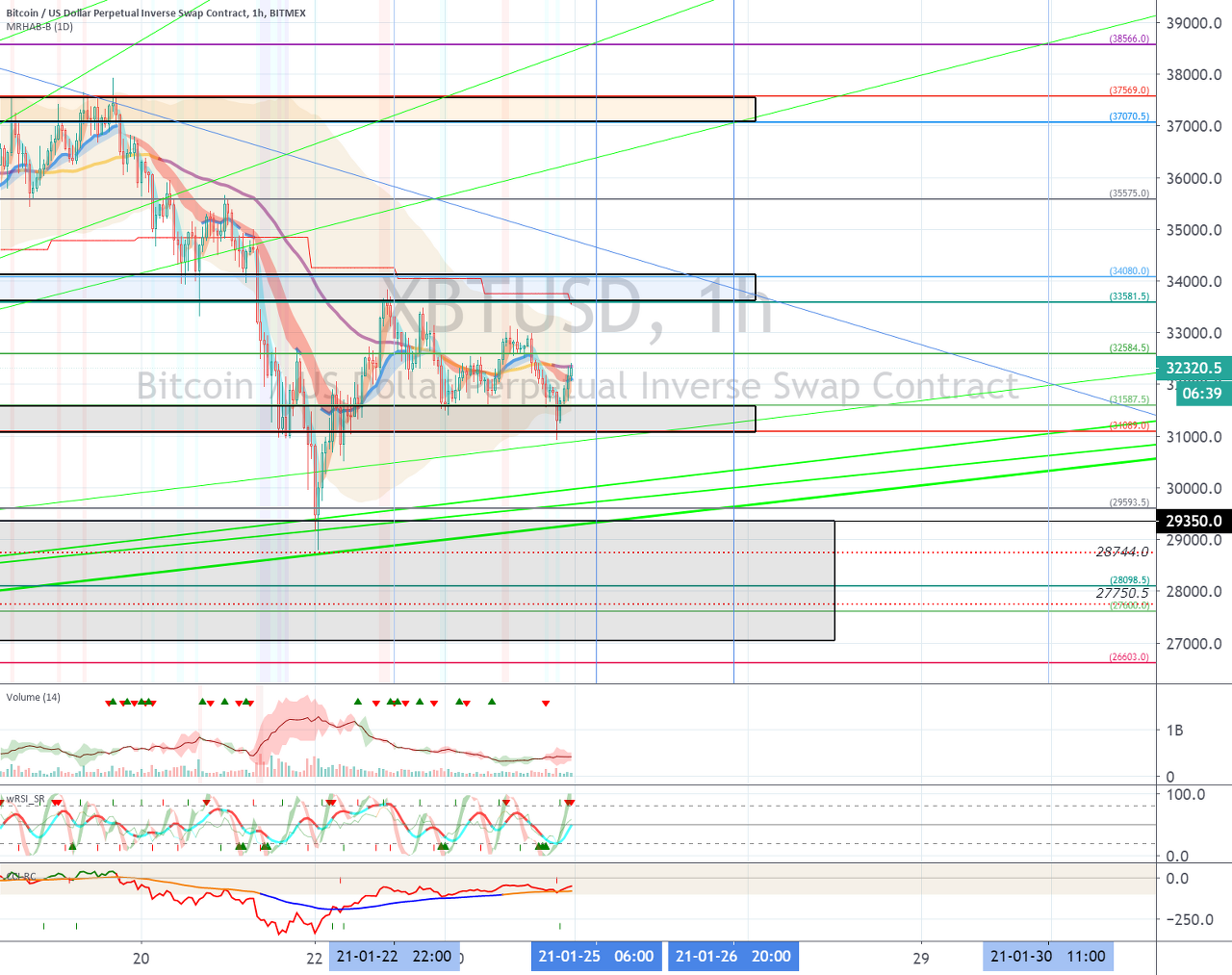 31400 지점에서 지지를 받고 1월 27일경의 변동성으로 28205.0-34595.0 구간에서 벗어나는 움직임이 나오는지 지켜봐야 합니다.