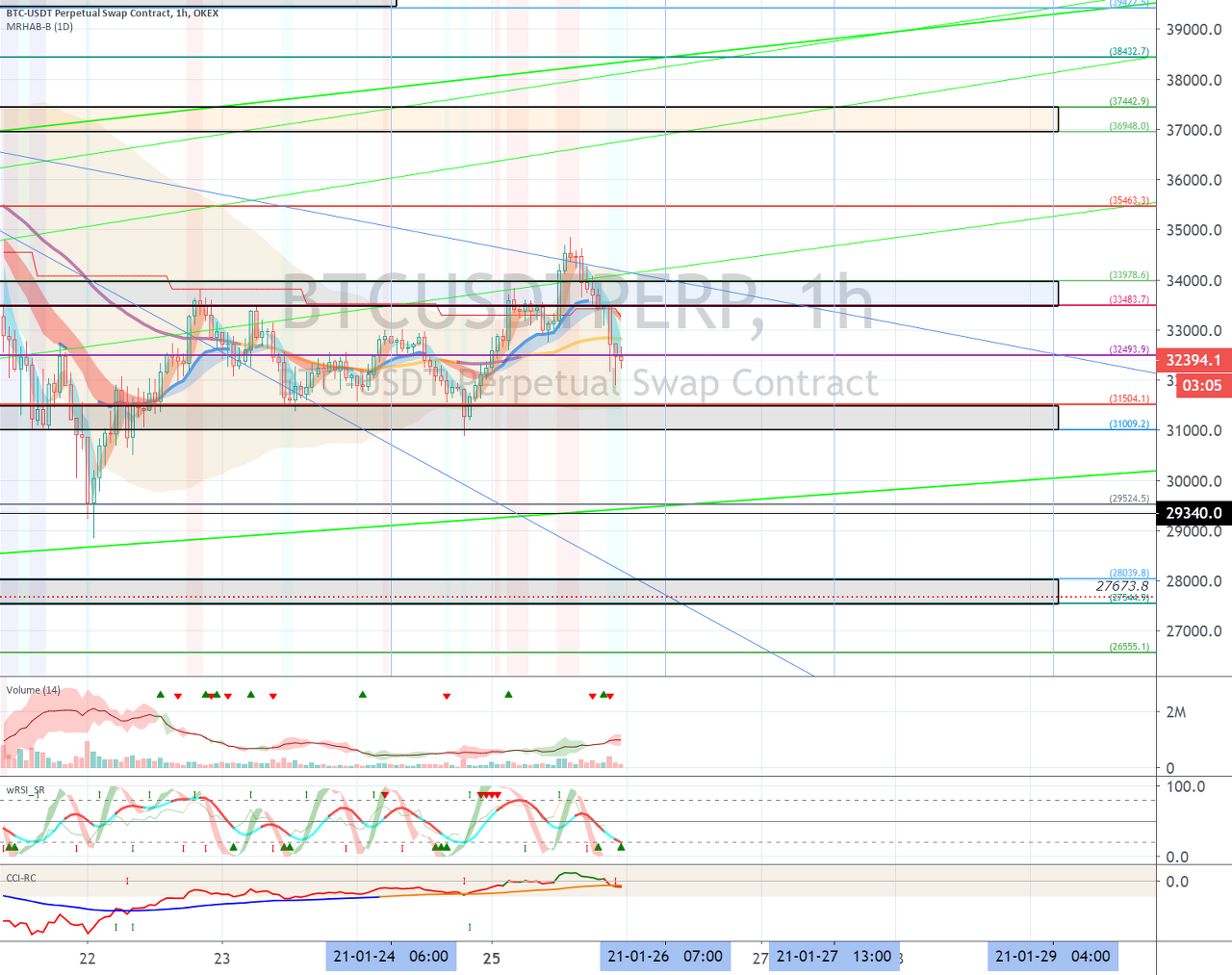 31400 지점에서 지지를 받고 1월 27일경의 변동성으로 28205.0-34595.0 구간에서 벗어나는 움직임이 나오는지 지켜봐야 합니다.