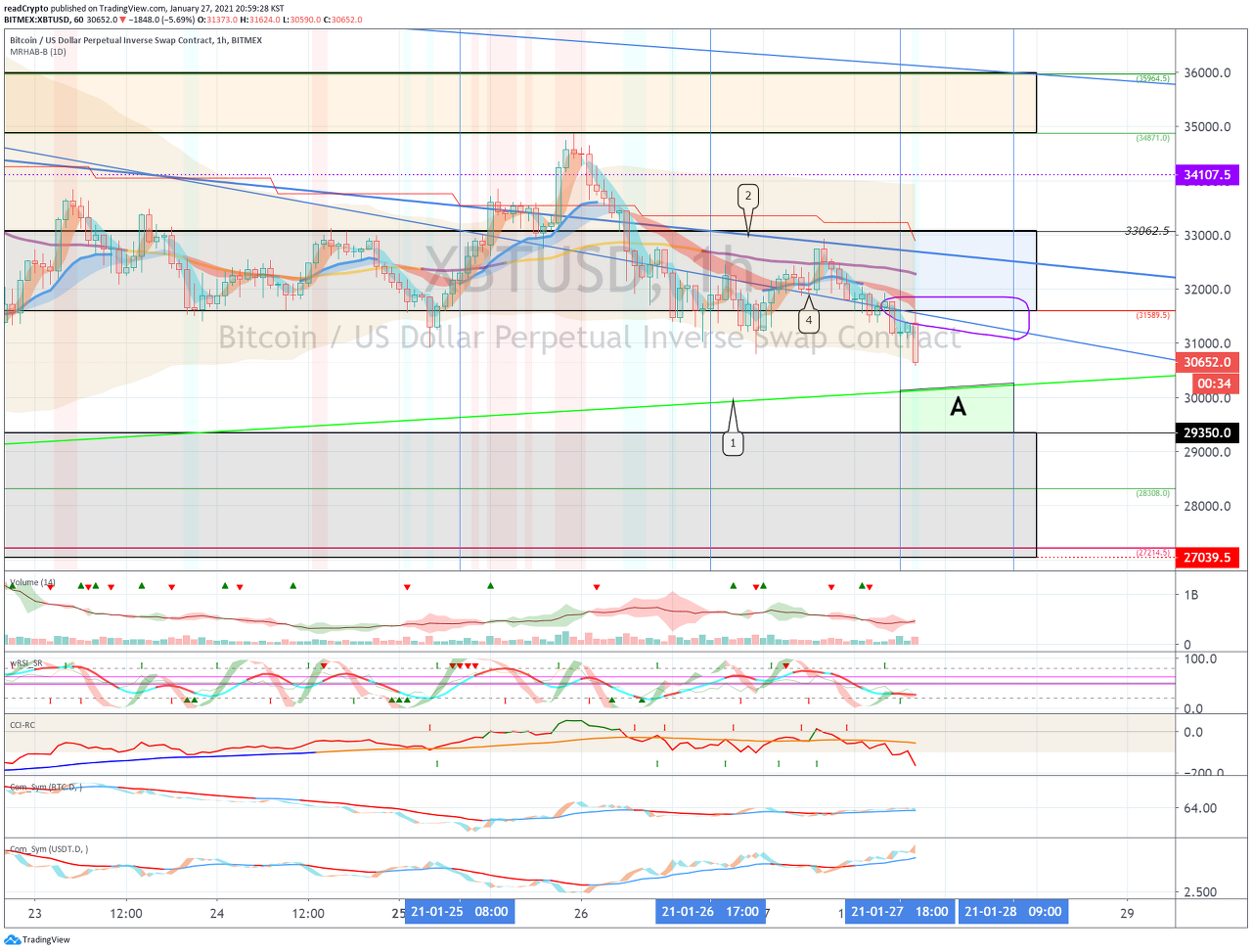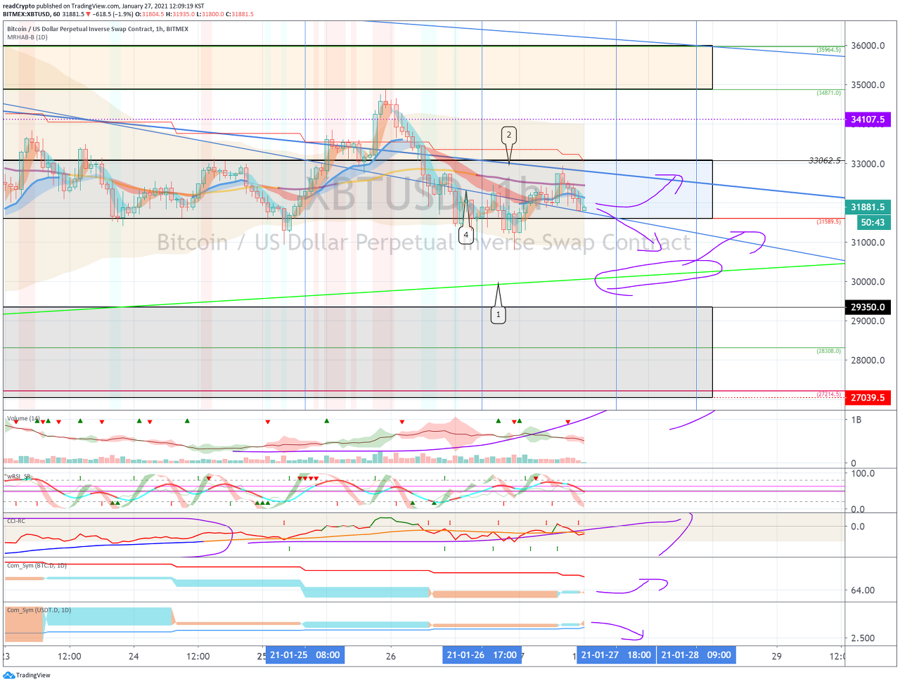 31400 지점에서 지지를 받고 1월 27일경의 변동성으로 28205.0-34595.0 구간에서 벗어나는 움직임이 나오는지 지켜봐야 합니다.