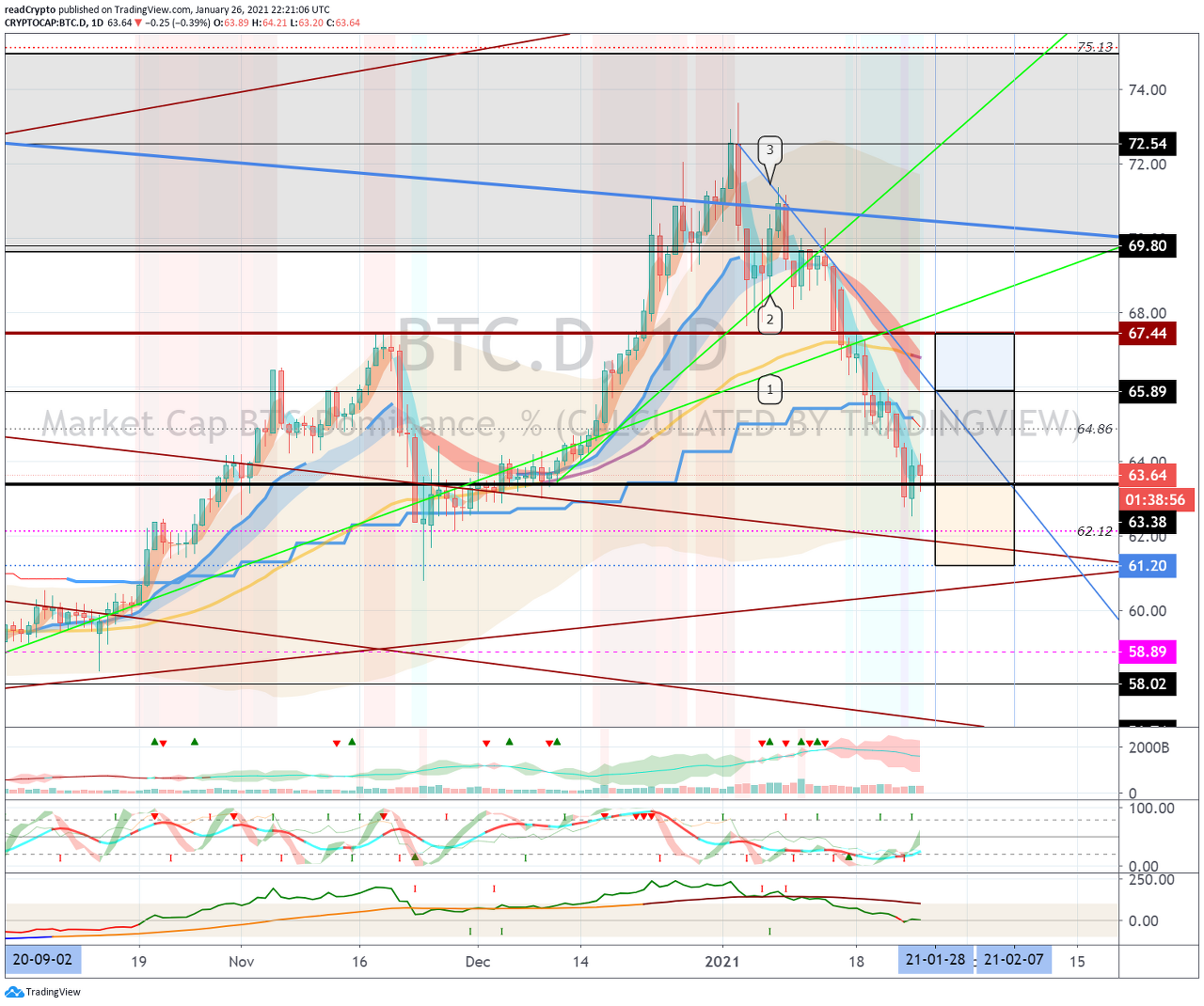 1월 28일경-2월 7일경 사이의 변동성으로 63.38-65.89 구간에서 벗어나는 움직임이 나오는지 지켜봐야 합니다.