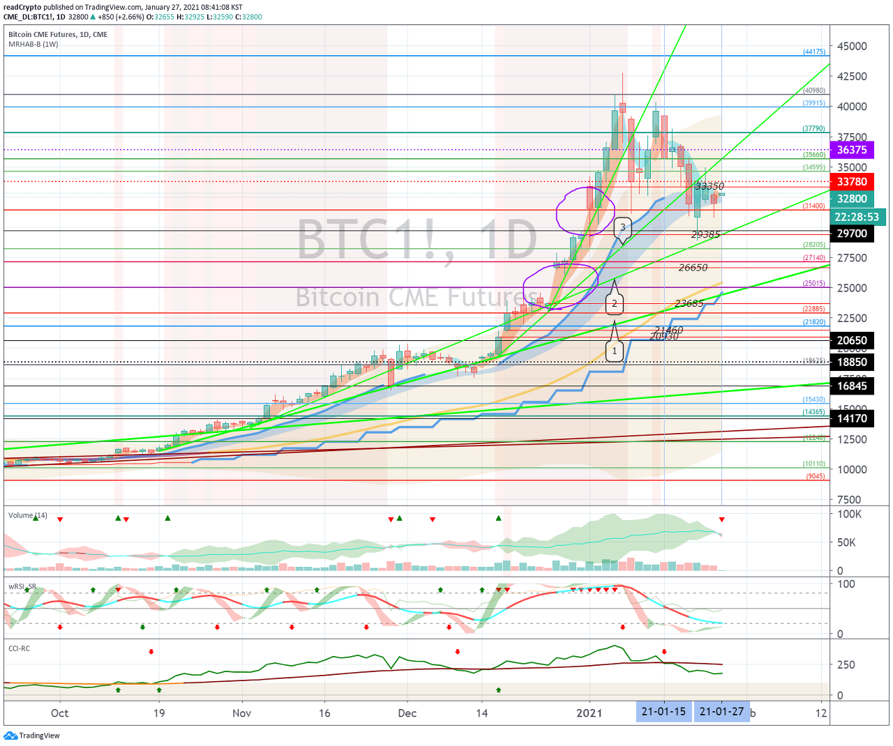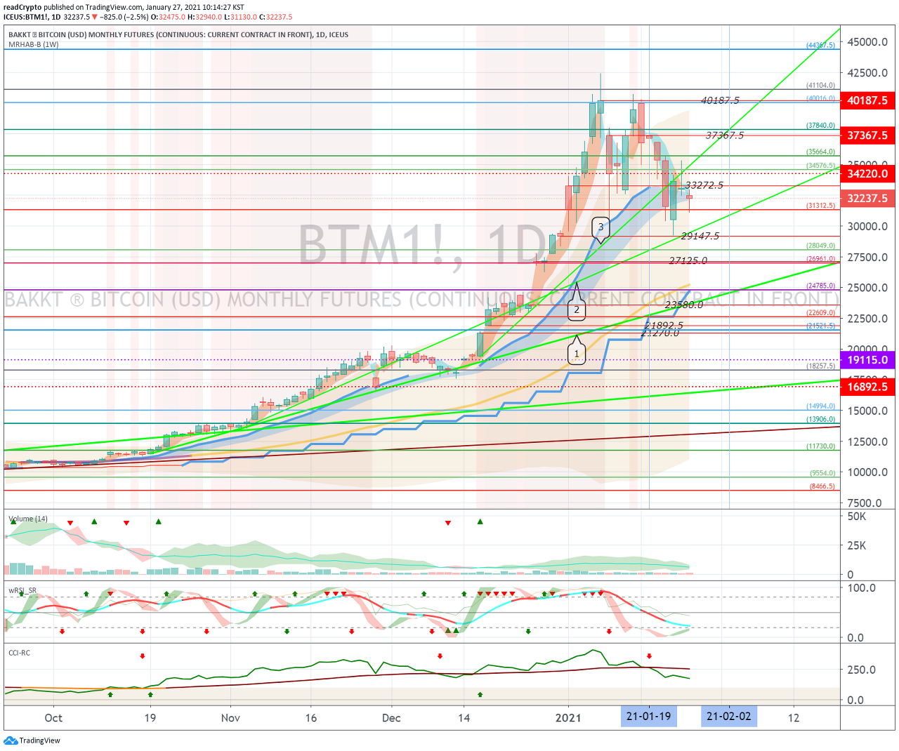 1월 28일경 (1월 27일-29일)에 시작되는 변동성으로 29350.0 지점과 35964.5 지점을 터치할 수 있으므로 신중한 트레이딩이 필요합니다.