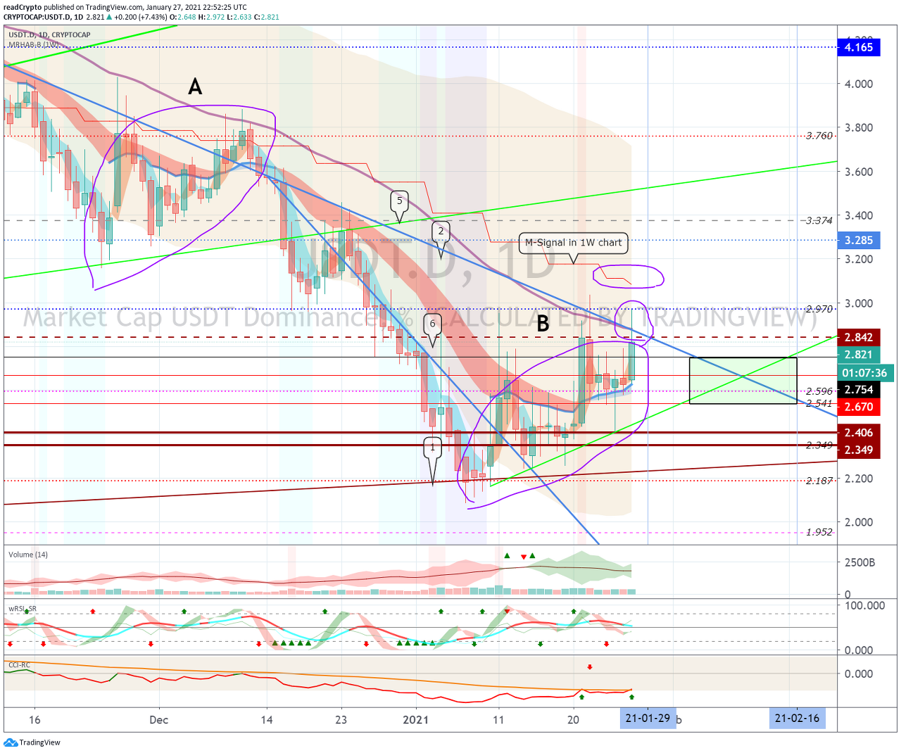 이에 따라서, 1월 29일경 (1월 28일-30일)의 변동성으로 2.842 지점과 하락 추세선 (2)을 터치하고 하락할 수 있는지 지켜봐야 합니다.