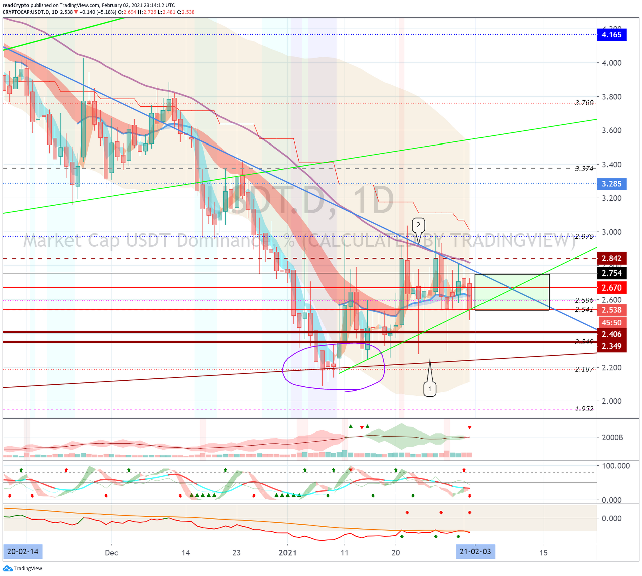 2월 3일경-16일경 사이에 2.541-2.754 구간에서 벗어나는 움직임이 나오는지 지켜봐야 합니다.