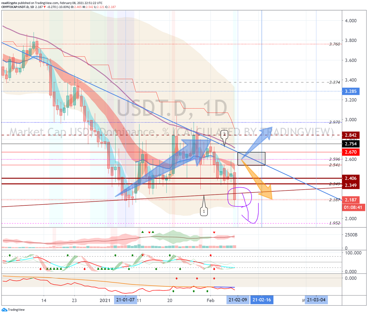 2월 3일경-16일경 사이에 2.187-2.842 구간에서 벗어나는 움직임이 나오는지 지켜봐야 합니다.