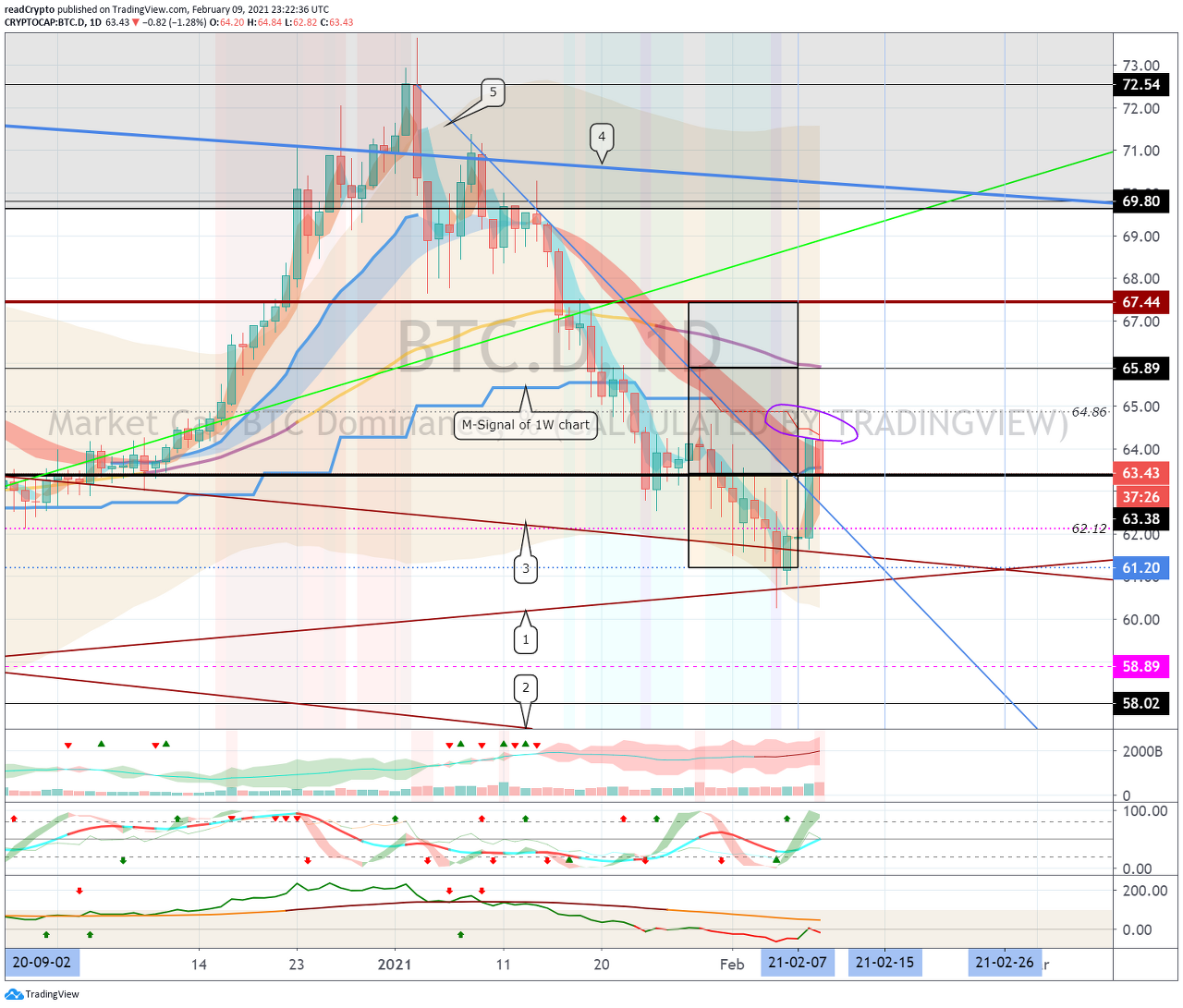 1W 차트의 M-Signal선에서 저항을 받고, 63.38 지점 이하로 하락할 수 있는지 지켜봐야 합니다.