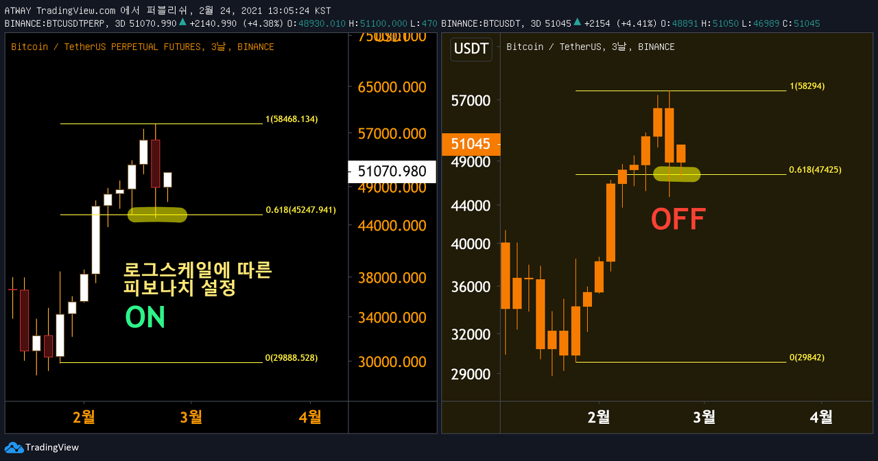 '로그스케일에 따른 피보나치' 적용시 0.618 피보나치 되돌림의 강한 지지 확인