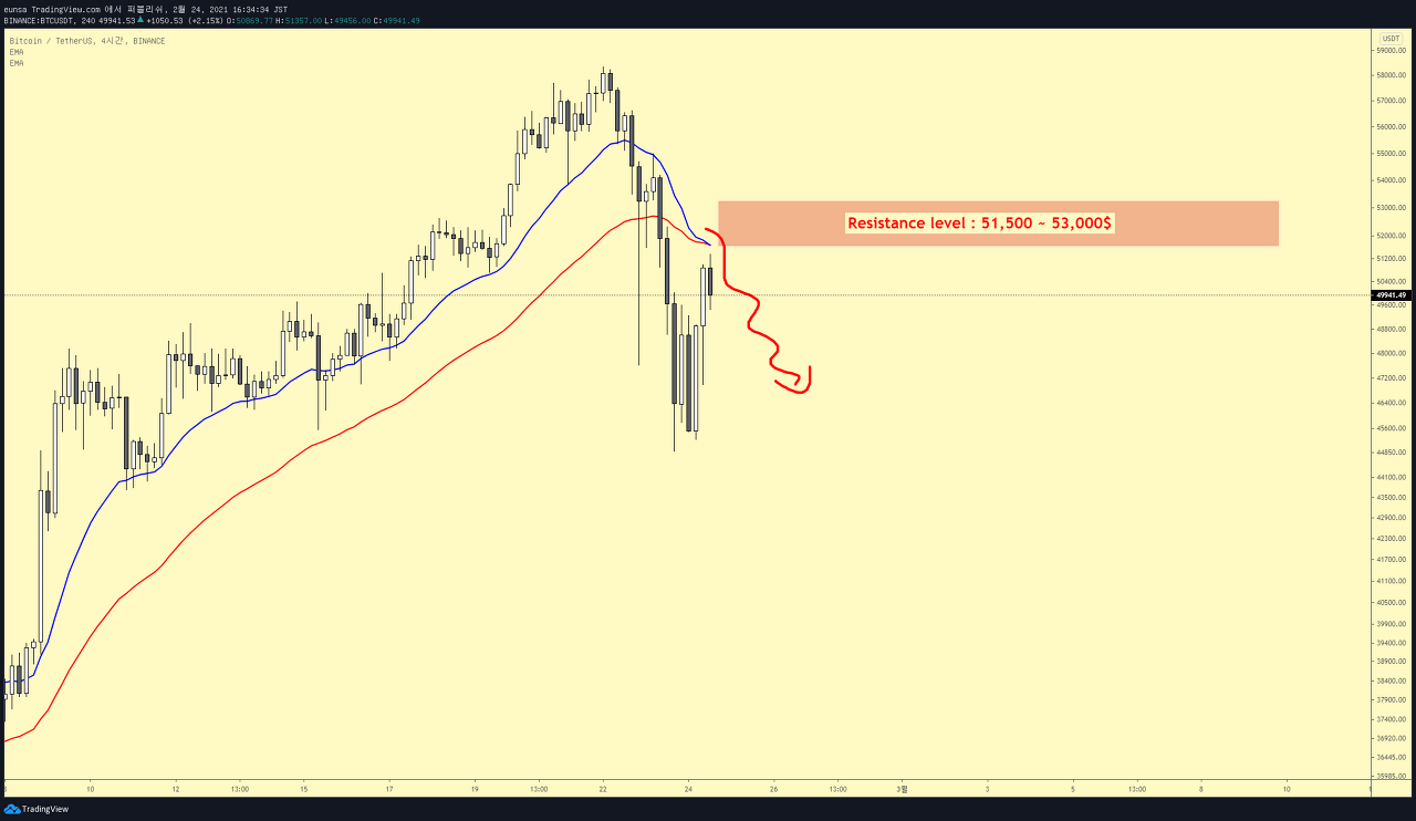 51500 ~ 53000$부근은 넘지 못할 것이며, 재차 하락할 것으로 보여집니다