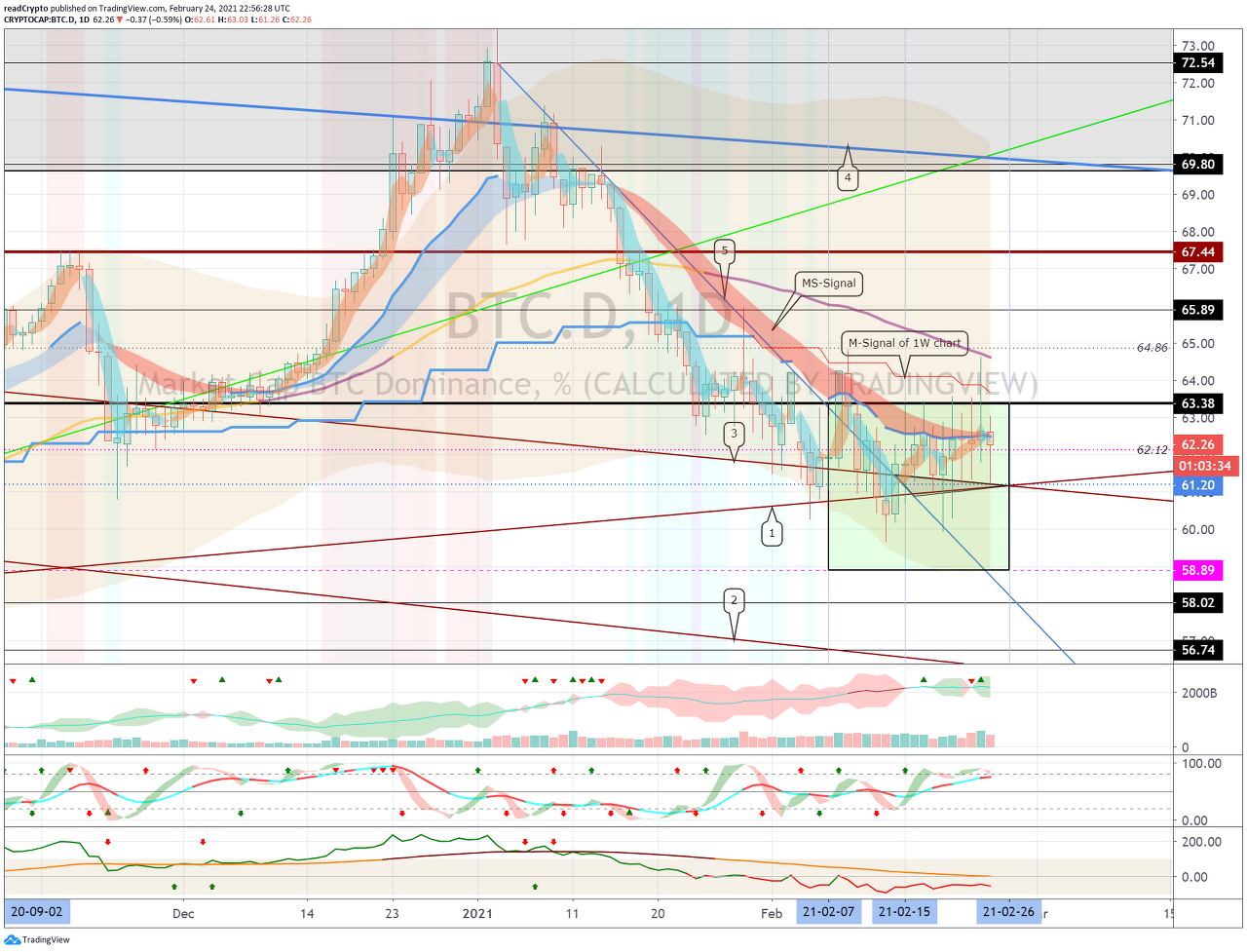 BTC 도미넌스가 63.38 지점 이상 상승하게 된다면, 알트코인의 가격은 하락 추세로 전환되는 모습을 나타나게 될 것으로 예상됩니다.