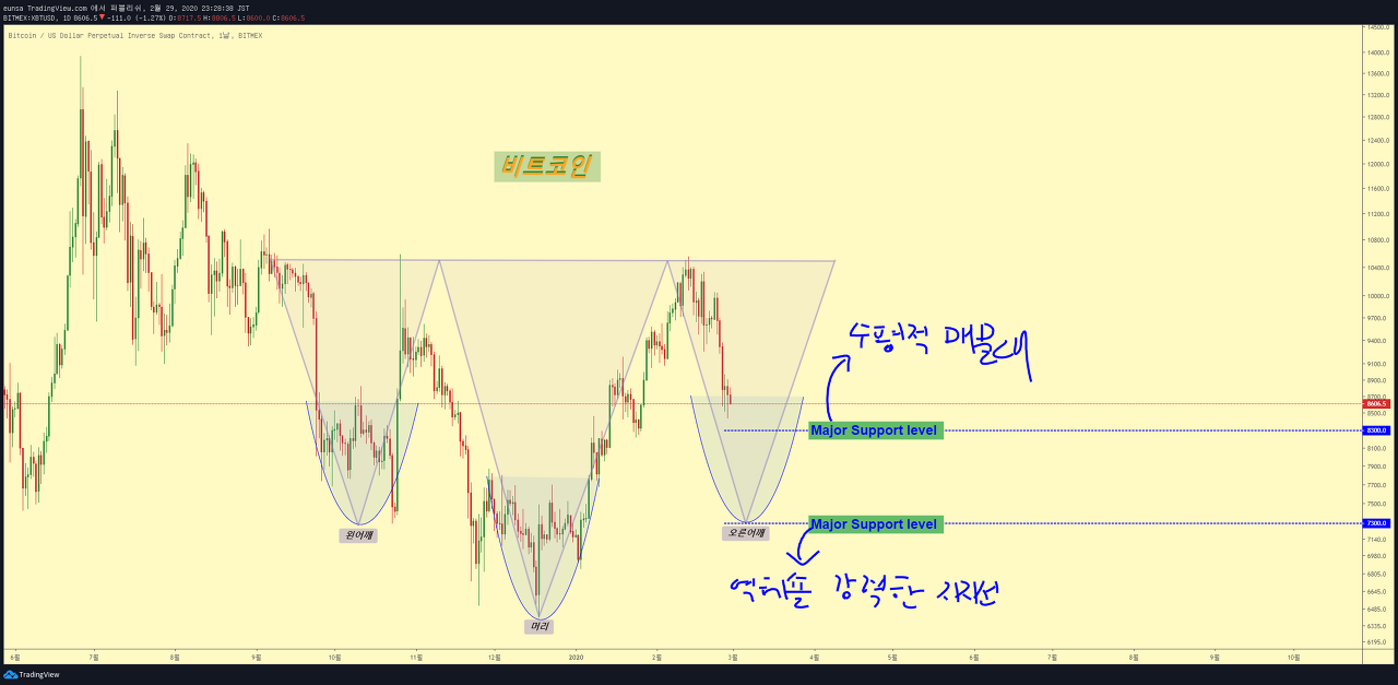 (3) 8200~8300$ 가격대가 무너진다면, Inverse H&S - 역헤드앤숄더의 오른쪽어깨선으로 7200~7300$ 까지가 하락할수 있는 최대 범위로 추정합니다