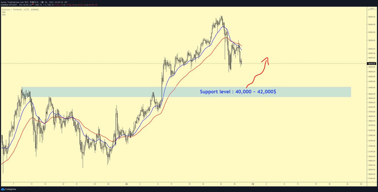 내려봤자 40000 ~ 42000$ 가격이하로 하락은 어려울 것이라 판단하며, 해당 가격대가 최적의 매수자리가 될 것으로 보여집니다.