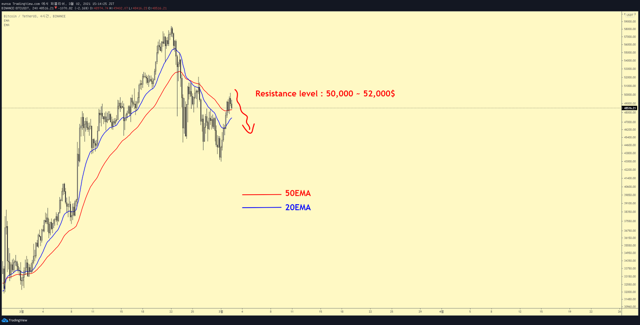 결국, 핵심 저항레벨은 50,000 ~ 52,000$부근으로 보여지며 해당 가격대를 돌파하기란 쉽지 않을 것으로 전망합니다