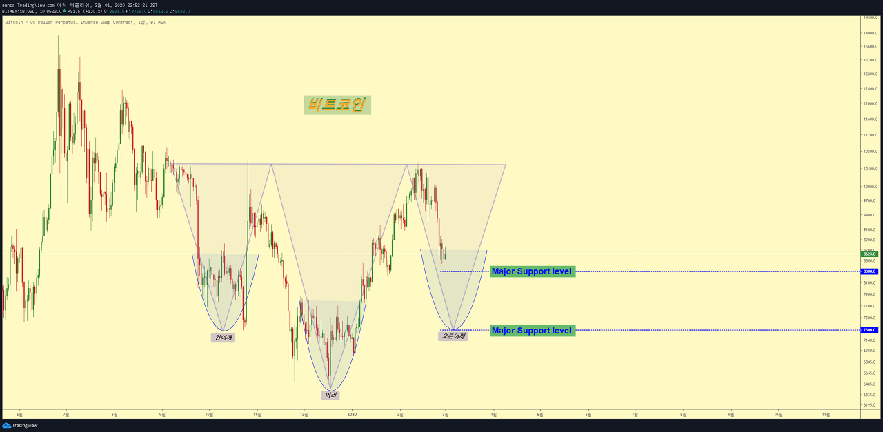 (4) 8200~8300$ 가격대가 무너진다면, Inverse H&S - 역헤드앤숄더의 오른쪽어깨선으로 7200~7300$ 까지가 하락할수 있는 최대 범위로 추정합니다