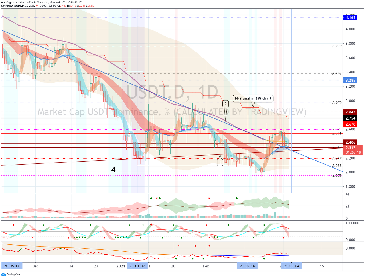 3월 4일경 (3월 3일-5일)의 변동성으로 하락 추세선 (2)와 상승 추세선 (1) 이하로 하락할 수 있는지 지켜봐야 합니다.