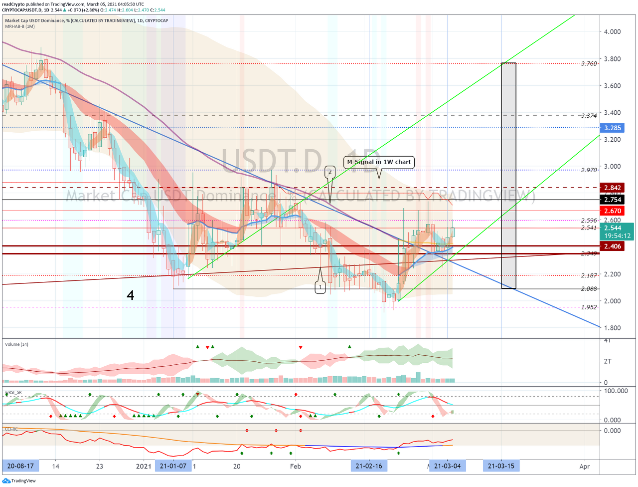 3월 7일경 (3월 6일-8일)의 변동성으로 상승 추세선 (1)이나 하락 추세선 (3) 중 어느 추세선을 따라 움직임이 나오는지 지켜봐야 합니다.