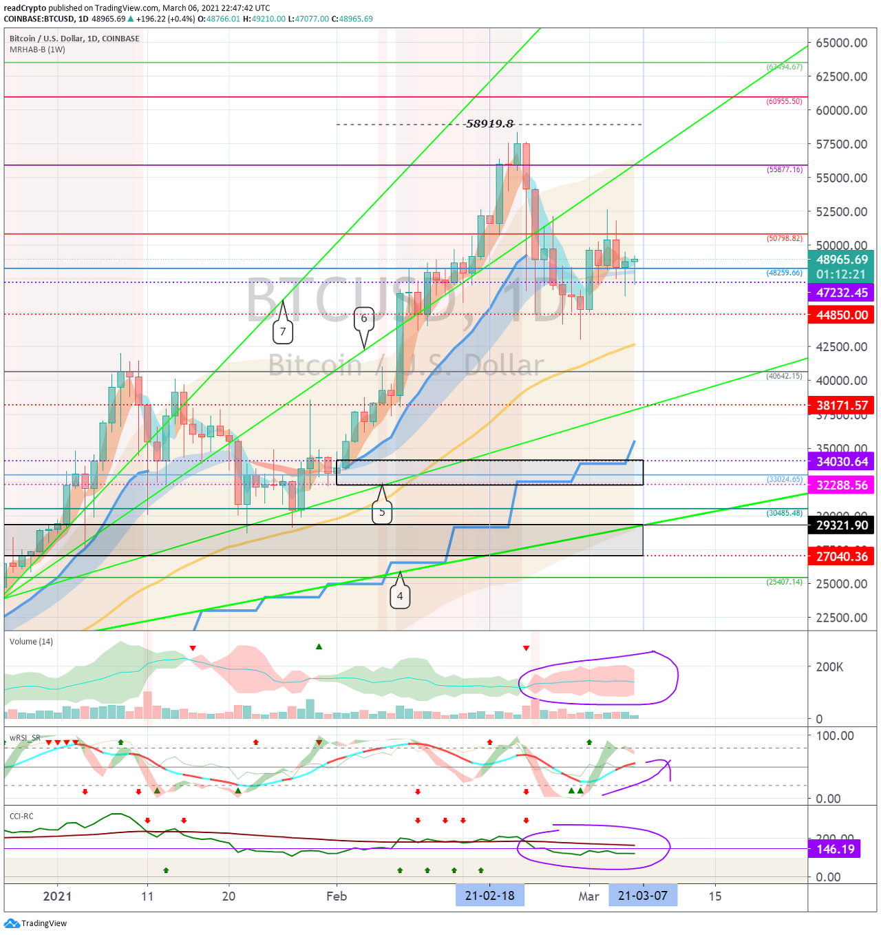 3월 8일경-15일경 사이의 변동성으로 40586.96-55811.30 구간에서 벗어나는 움직임이 나오는지 지켜봐야 합니다.