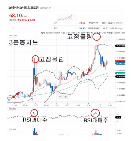 주가 아래 그림을 일반적으로 숫자 70+++ 이상이면 과매수 상태로 해석하고,30이하로 내려가면 과매도 상태로 해석을 합니다.예를들어 주가가 올라가는데 RSI 지표가 70을 넘었다면 이를 과매수 상태로 해석하고 되도록 상단에 물릴 가능성이 높기 때문에 매수하기 적합하지 않다고 여깁니다.