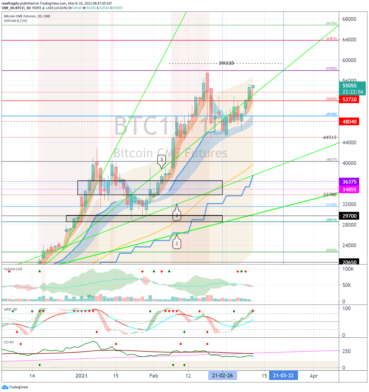 3월 5일경-15일경 사이의 변동성으로 50752.0-60904.0 구간에서 벗어나는 움직임이 나오는지 지켜봐야 합니다.