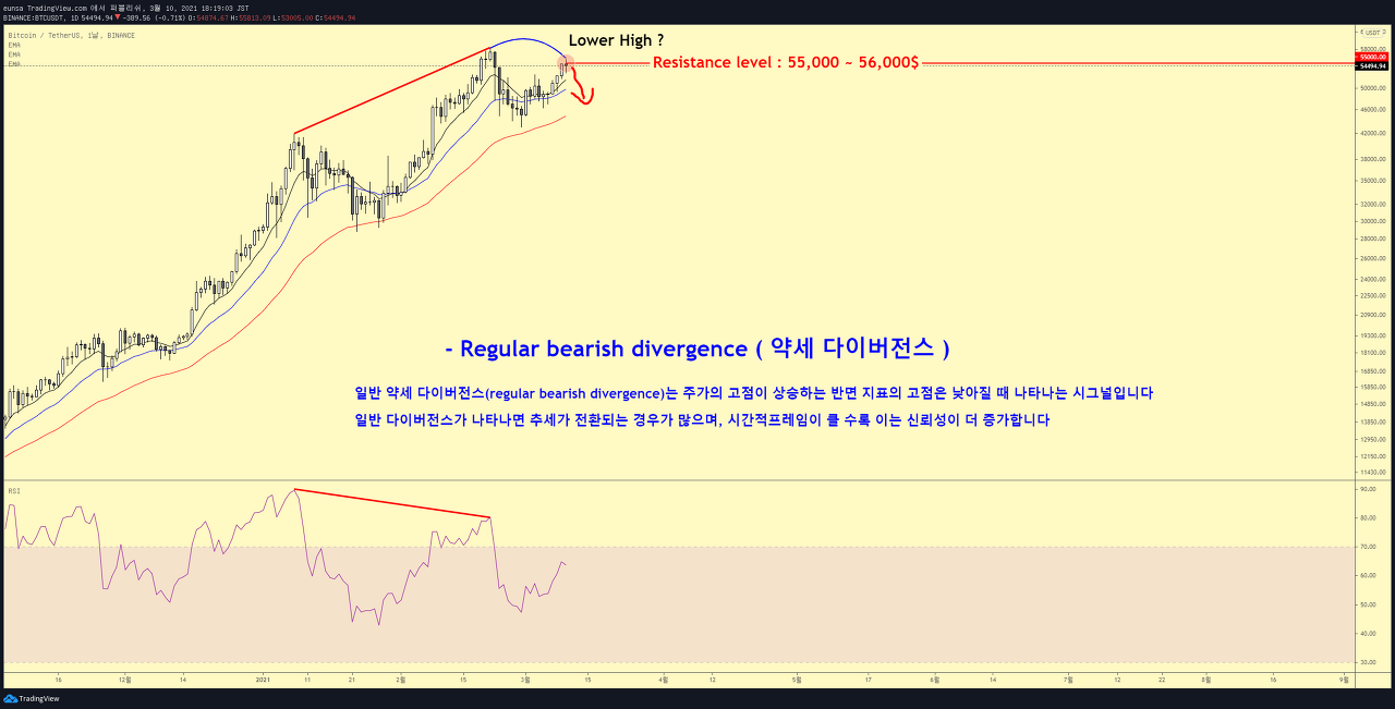 따라서, 현재 가격 부근인 55,000 ~ 56,000$은 주요한 저항레벨로 작용될 것이라 보고 있으며 전고점 돌파는 어려워보입니다