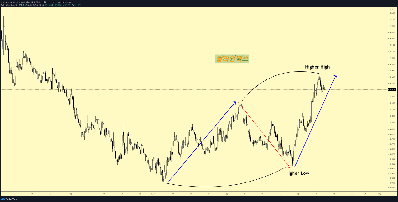 달러인덱스는 저점을 형성하고 저점을 높여주는 Higher Low의 파동을 보여주고 있습니다