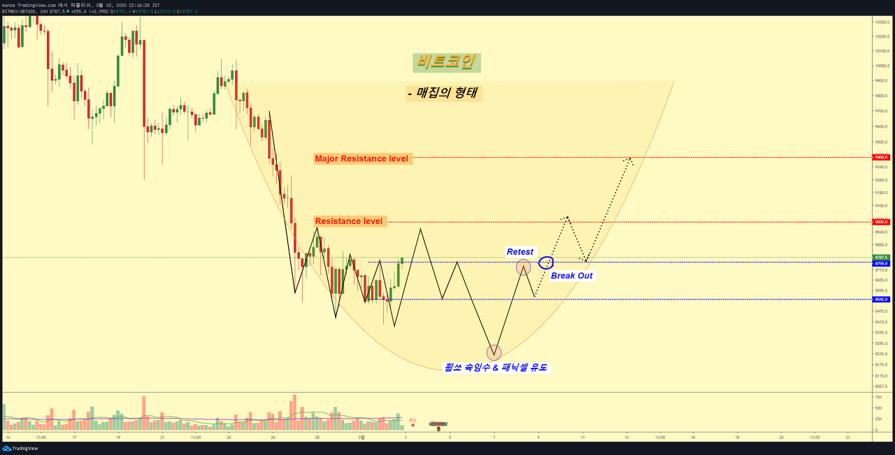 (3) 해당 1차 Major Support level이 무너지지 않으며, 상승모멘텀을 이끌경우, 아주 강력한 비트코인의 매수강세에 대해서 고려하십시오