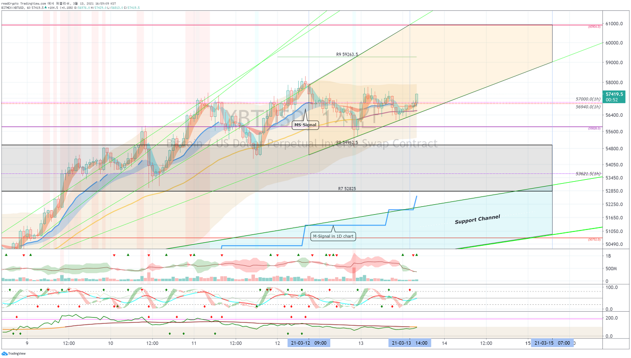 2번째 상승 채널에서 상승하여 59263.5 지점을 돌파하기 위한 시도가 나올 수 있는지 지켜봐야 합니다.