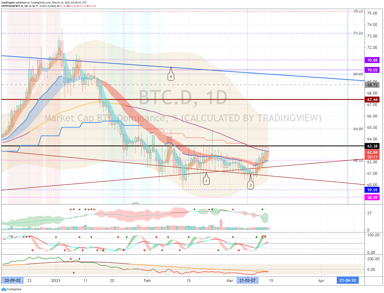 알트코인의 상승장은 BTC 도미넌스가 63.38 지점 이하에 위치해 있을 때라 생각합니다.