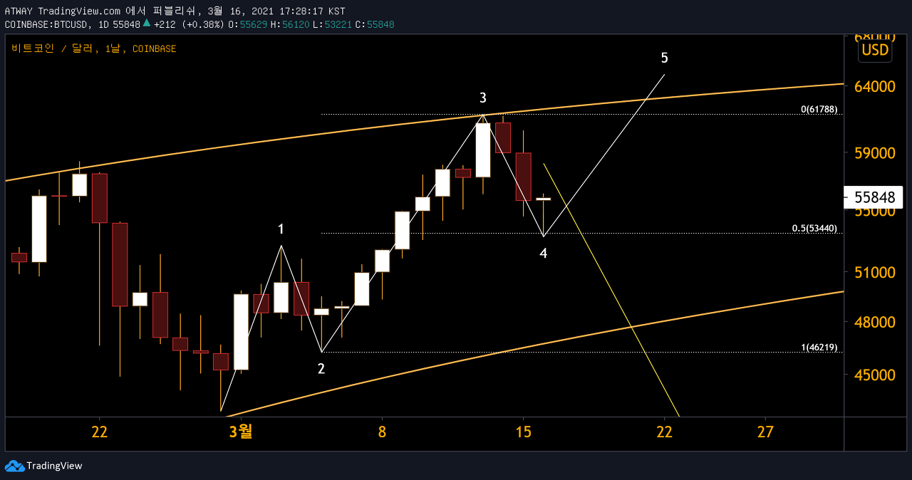 주말 중에 나온 고점을 3파로 간주할 시 현재까지 나온 조정은 3파에 대한 50% 되돌림입니다.
