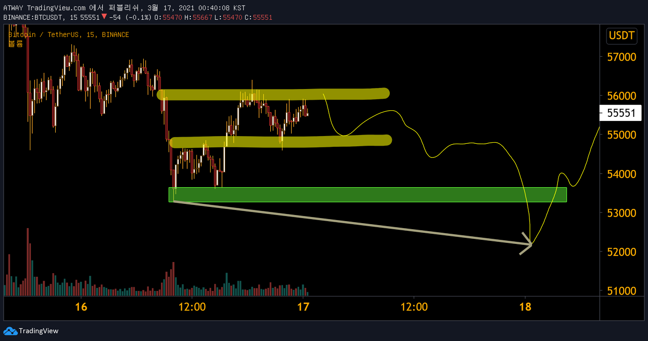 그럼 55500달러 즘 오면 탈자리를 안주거나 반등을 확실히 만들어야 하는데 지금은 55000달러 근처까지 자리를 다주고 있기 때문에 저점을 한번 더 깰 가능성까지 열어둬야 하는 상황이 되었다고 보는것입니다.