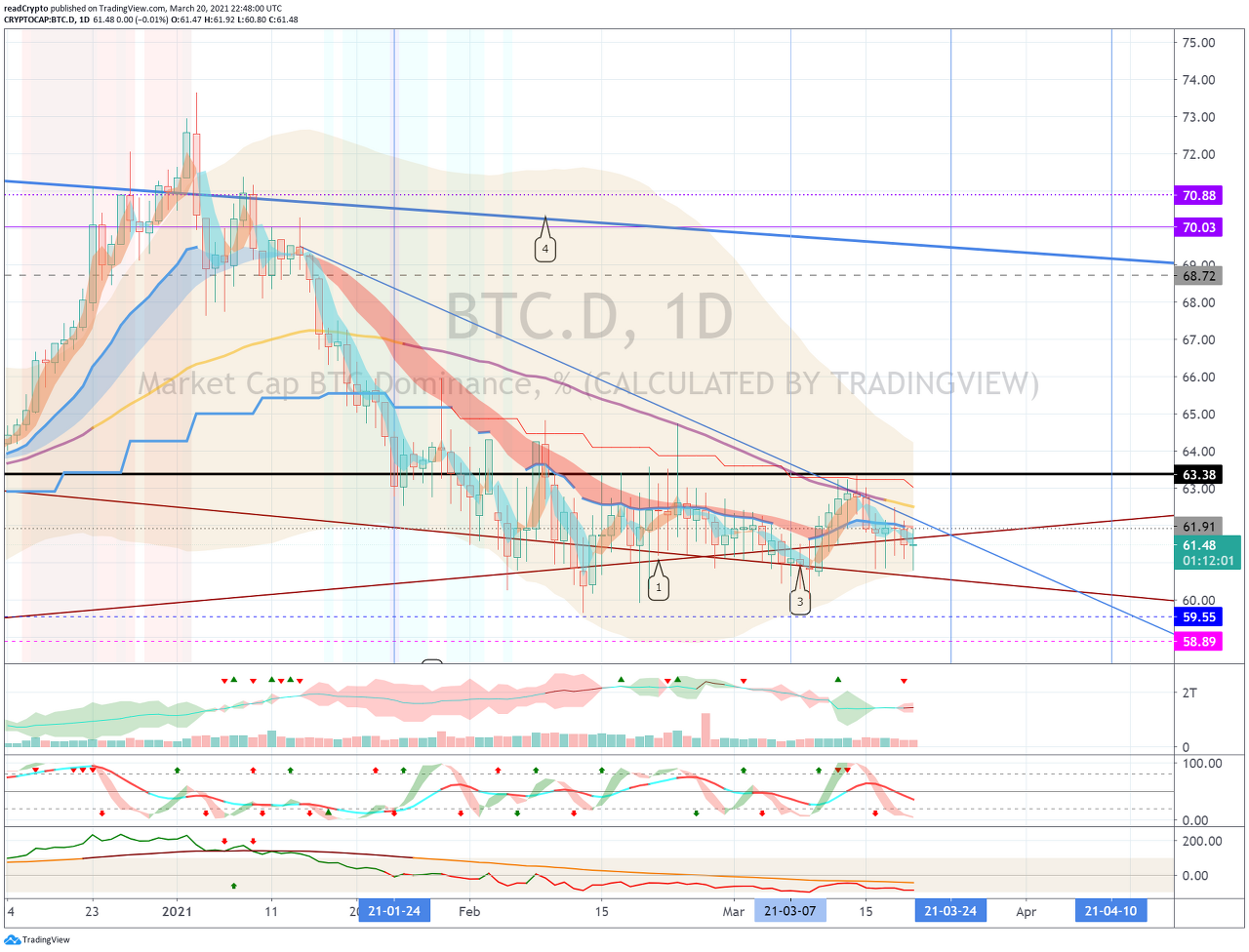 알트코인의 상승장은 BTC 도미넌스가 63.38 지점 이하에 위치해 있을 때라 생각합니다.