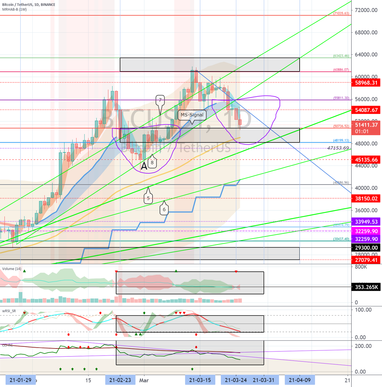 61712000 지점에서 하락한다면, 58981000 지점을 터치할 수 있으므로 단기 Stop Loss가 필요합니다.