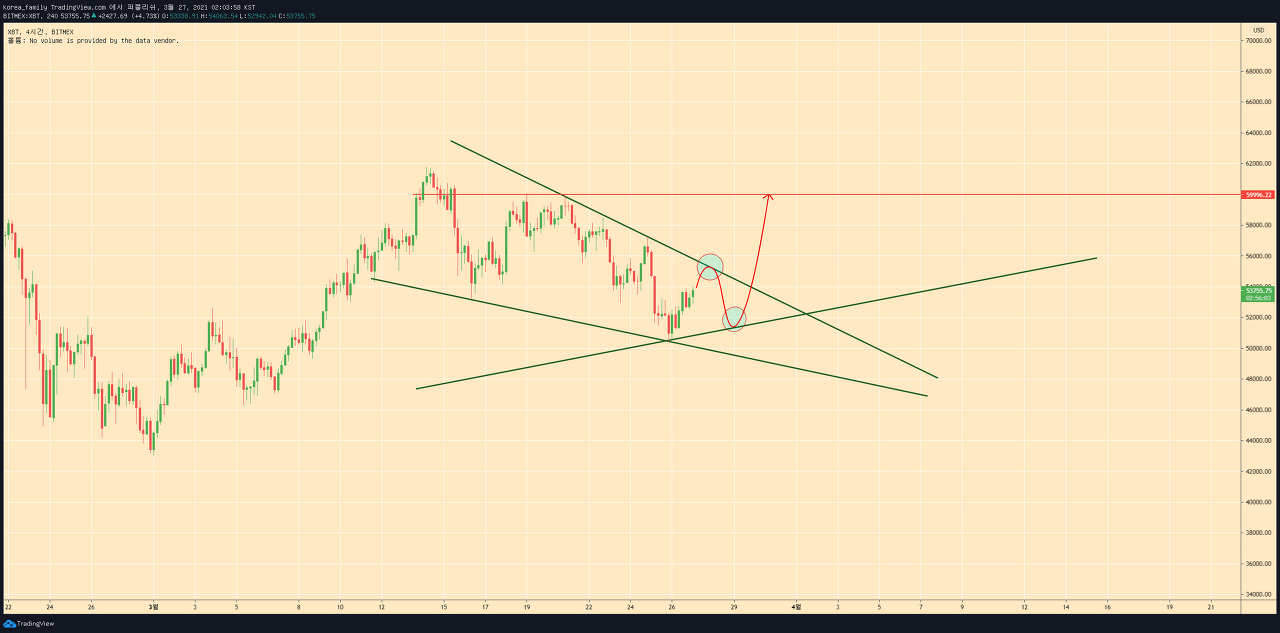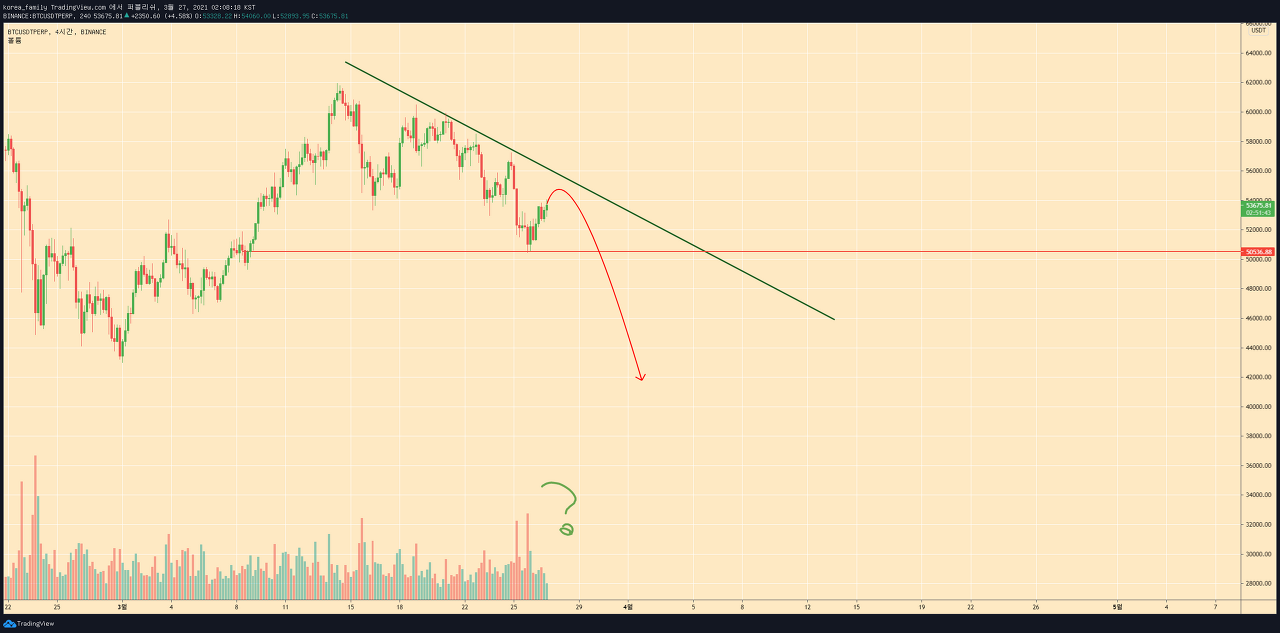 패턴이 완성할지는 가장쉽게 보는건 하단트렌드를 이탈하는지 여부입니다. 꾸준하게 지켜준다면 51000을 이탈한다 하더라도