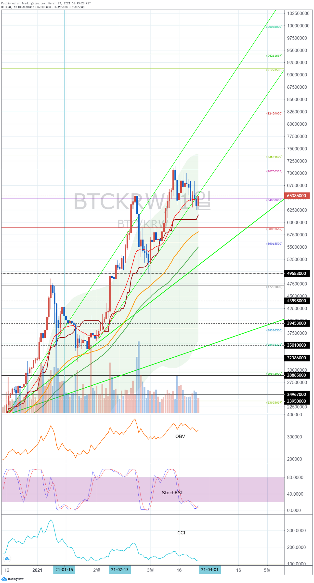 3월 27일경의 변동성으로 상승 추세선을 따라 상승할 수 있는지 지켜봐야 합니다.