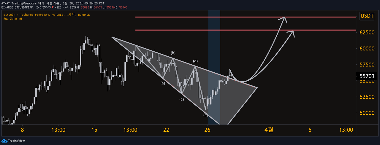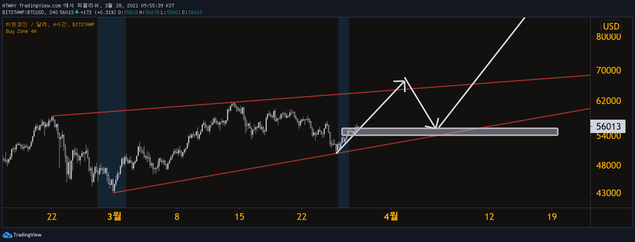 4시간차트에서 52K부터 매수신호가 잡힌 상태입니다.